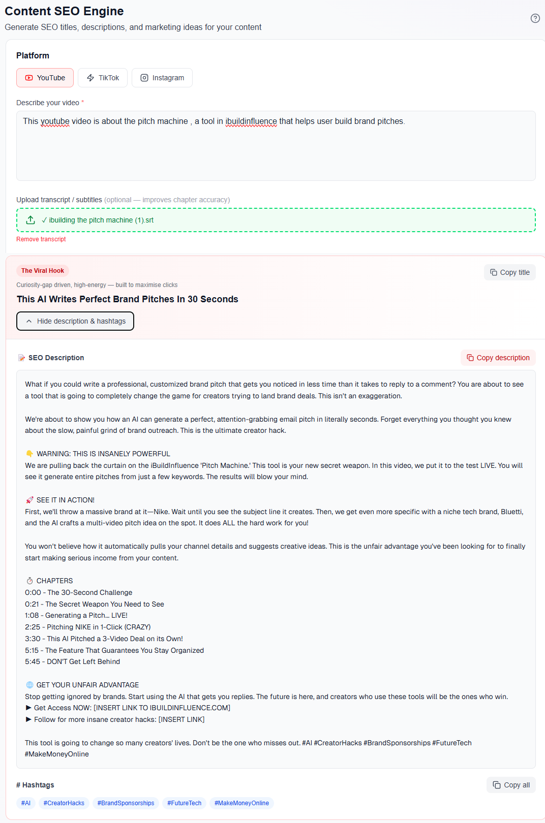 Building social SEO is hard to do consistently when you’re juggling ideas, scripts, publishing, and analytics. iBuildInfluence helps you run a creator-specific content workflow so you can focus on ranking instead of scrambling. Start with Trend Scout to find topics before they peak, then use Hook Lab to generate and score hooks for your intent (so viewers stay long enough for ranking signals). For packaging, the Content Generator can turn one idea into a full content package—script, caption, and structured deliverables you can reuse across a series.